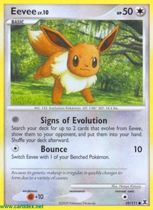 Kosten: Durchsuche dein Deck nach bis zu 2 Karten, die sich aus Evoli entwickeln, zeige sie deinem Gegner und nimm sie auf die Hand. Mische dein Deck danach.  Schaden: