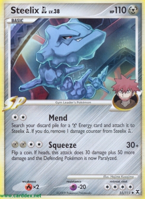 Kosten: Durchsuche deinen Ablagestapel nach 1 -Energiekarte und lege sie an Stahlos GL an. Wenn du das machst, entferne 1 Schadensmarke von Stahlos GL.  Schaden: