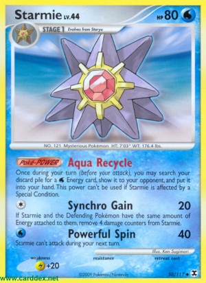 Einmal während deines Zuges (vor deinem Angriff) kannst du deinen Ablagestapel nach 1 -Energiekarte durchsuchen, sie deinem Gegner zeigen und auf die Hand nehmen. Diese Poké-Power kann nicht benutzt werden, wenn Starmie von einem Speziellen Zustand betroffen ist.