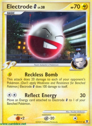 Dieser Angriff fügt jedem Pokémon deines Gegners 20 Schadenspunkte zu. (Wende Schwäche und Resistenz bei Pokémon auf der Bank nicht an.) Lektrobal G fügt sich selbst 100 Schadenspunkte zu.