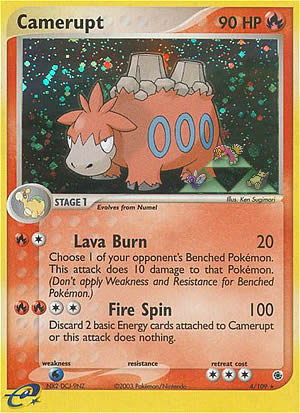 Kosten: Discard 2 basic Energy cards attached to Camerupt or this attack does nothing.  Schaden: