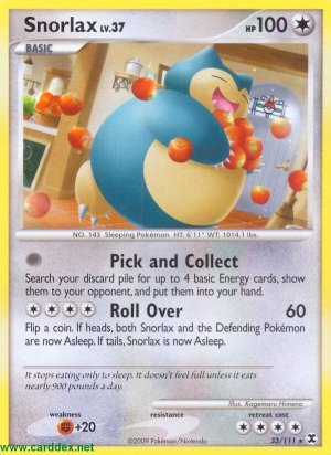 Kosten: Wirf 1 Münze. Bei „Kopf“ schlafen Relaxo und das Verteidigende Pokémon jetzt. Bei „Zahl“ schläft Relaxo jetzt.  Schaden:
