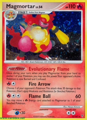 Einmal während deines Zuges kannst du, wenn du Magbrant von deiner Hand spielst, um 1 deiner Pokémon zu entwickeln, diese Poké-Power benutzen. Das Aktive Pokémon deines Gegners ist jetzt verbrannt und verwirrt.