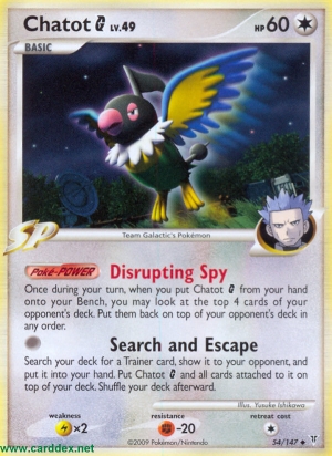 Kosten: Durchsuche dein Deck nach 1 Trainerkarte, zeige sie deinem Gegner und nimm sie auf die Hand. Lege Plaudagei G und alle an es angelegten Karten auf dein Deck zurück. Mische dein Deck danach.  Schaden: