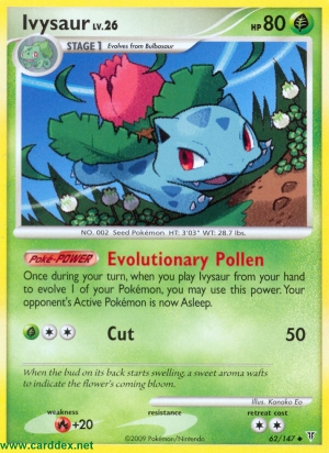 Einmal während deines Zuges kannst du, wenn du Bisaknosp von deiner Hand spielst, um 1 deiner Pokémon zu entwickeln, diese Poké-Power benutzen. Das Aktive Pokémon deines Gegners schläft jetzt.