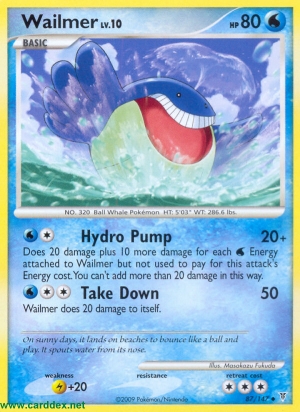 Dieser Angriff fügt 20 Schadenspunkte plus 10 weitere Schadenspunkte für jede an Wailmer angelegte -Energie zu, die nicht zum Bezahlen der Energiekosten für diesen Angriff verwendet wurde. Es lassen sich so nicht mehr als 20 Schadenspunkte hinzufügen.