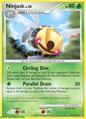 Dieser Angriff fügt jedem Pokémon deines Gegners 10 Schadenspunkte zu. (Wende Schwäche und Resistenz bei Pokémon auf der Bank nicht an.) Tausche Ninjask gegen 1 Pokémon auf deiner Bank aus.