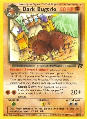 Jedesmal, wenn sich das aktive Pokemon deines Gegners zurückzieht, wirft dein Gegner eine Münze. Bei Zahl fügt diese Fähigkeit diesem Pokemon 20 Schadenspunkte zu. (Schwäche und Resistenz nicht anwenden.) Diese Fähigkeit verliert ihre Wirkung, solangeDunkles Digdri schläft, verwirrt oder gelähmt ist.