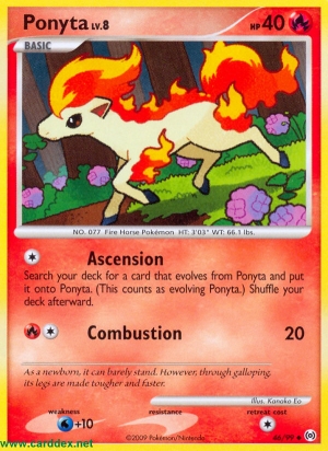 Durchsuche dein Deck nach einer Karte, die sich aus Ponita entwickelt, und lege diese auf Ponita. (Dies zählt als Entwickeln von Ponita.) Mische dein Deck danach.