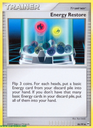 Beschreibung: Wirf 3 Münzen. Nimm für jedes Mal, wenn die Münze „Kopf“ gezeigt hat, eine Basis-Energiekarte von deinem Ablagestapel auf deine Hand. Falls du nicht genug Basis-Energiekarten in deinem Ablagestapel hast, nimm so viele wie möglich auf deine Hand.