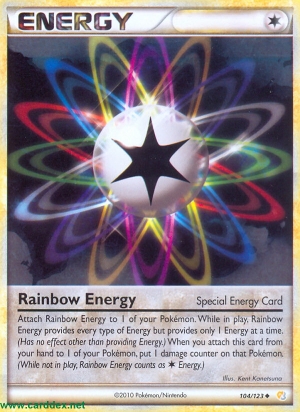 Beschreibung: Lege Regenbogen-Energie an 1 deiner Pokémon an. Solange Regenbogen-Energie im Spiel ist, zählt sie als jeder Energietyp, spendet aber immer nur eine Energie auf einmal. (Sie hat keinen Effekt, außer dass sie Energie spendet.) Wenn du diese Karte aus deiner Hand an 1 deiner Pokémon anlegst, lege 1 Schadensmarke auf dieses Pokémon. (Wenn Regenbogen-Energie nicht im Spiel ist, zählt sie als -Energie.)