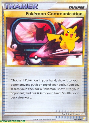 Beschreibung: Wähle 1 Pokémon-Karte von deiner Hand, zeige sie deinem Gegner und lege sie auf dein Deck. Wenn du das machst, durchsuche dein Deck nach 1 Pokémon-Karte, zeige sie deinem Gegner und nimm sie auf die Hand. Mische anschließend dein Deck.