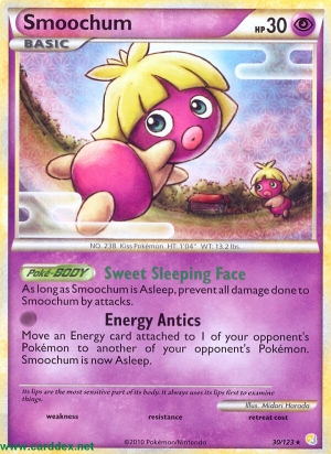 Kosten: Lege eine an 1 Pokémon deines Gegners angelegte Energiekarte an 1 anderes Pokémon deines Gegners an. Kussilla schläft jetzt.   Schaden: