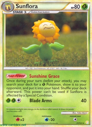 Einmal während deines Zuges (vor deinem Angriff) kannst du dein Deck nach 1 -Pokémon durchsuchen, es deinem Gegner zeigen und auf die Hand nehmen. Mische anschließend dein Deck. Diese Poké-Power kann nicht benutzt werden, wenn Sonnflora von einem Speziellen Zustand betroffen ist.