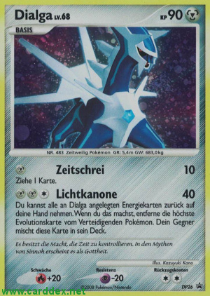 Kosten: Du kannst alle an Dialga angelegten Energiekarten zurück auf deine Hand nehmen. Wenn du das machst, entferne die höchste Evolutionskarte vom Verteidigenden Pokémon. Dein Gegner mischt diese Karte in sein Deck.  Schaden: