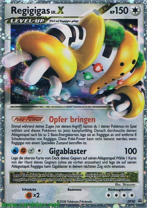 Einmal während deines Zuges (vor deinem Angriff) kannst du 1 deiner Pokémon im Spiel wählen und kampfunfähig machen. Danach durchsuche deinen Ablagestapel nach bis zu 2 Basis-Energiekarten, lege sie an Regigigas an und entferne 8 Schadensmarken von Regigigas. Diese Poké-Power kann nicht benutzt werden, wenn Regigigas von einem Speziellen Zustand betroffen ist.