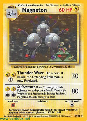 Kosten: Fügt jedem Pokemon auf der Bank eines Spielers 20 Schadenspunkte zu. (Schwäche und Resistenz nicht auf Pokemon auf der Bank anwenden!) Magneton fügt sich selbst 80 Schadenspunkte zu.  Schaden:
