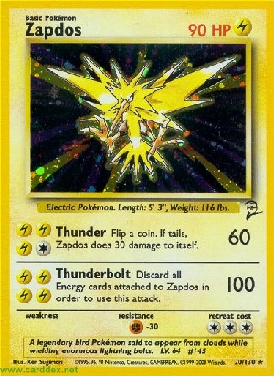 Kosten: Wirf eine Münze. Bei Zahl fügt sich Zapdos selbst 30 Schadenspunkte zu.  Schaden: