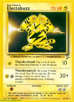 Wirf eine Münze. Bei Kopf fügt dieser Angriff 30 Schdenspunkte plus 10 weitere Schadenspunkte zu. Bei Zahl fügt dieser Angriff 30 Schadenspunkte zu, und Elektek fügt sich selbst 10 Schadenspunkte zu.