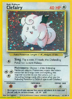 Kosten: Wähle einen der Angriffe des verteidigenden Pokemon. Metronom kopiert diesen Angriff, außer seiner Energiekosten und was sonst noch für den Einsatz dieses Angriffs erforderlich ist, wie z.B. das Entfernen von Energiekarten. (Unabhängig vom Typ des Verteidigenden Pokémon ist der Typ der Piepi immer noch farblos.)  Schaden: