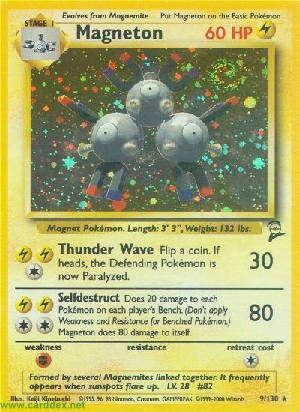 Kosten: Fügt jedem Pokemon auf der Bank eines Spielers 20 Schadenspunkte zu. (Schwäche und Resistenz nicht auf Pokemon auf der Bank anwenden!) Magneton fügt sich selbst 80 Schadenspunkte zu.  Schaden: