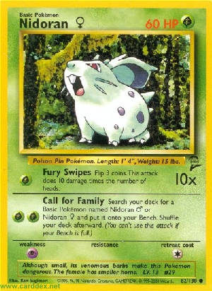 Kosten: Suche in deinem Deck nach einer Basis-Pokemon-Karte mit dem Namen Nidoran M oder Nidoran W und lege sie auf deine Bank. Mische dein deck dannach. (Du kannst diesen Angriff nicht einsetzen, wenn deine Bank voll ist.)  Schaden:
