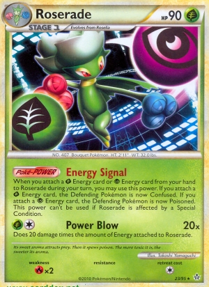Wenn du in deinem Zug 1 -Energiekarte oder 1 -Energiekarte aus deiner Hand an Roserade anlegst, kannst du diese Poké-Power verwenden. Wenn du 1 -Energiekarte anlegst, ist das Verteidigende Pokémon jetzt verwirrt. Wenn du 1 -Energiekarte anlegst, ist das Verteidigende Pokémon jetzt vergifet. Diese Poké-Power kann nicht benutzt werden, wenn Roserade von einem Speziellen Zustand betroffen ist.