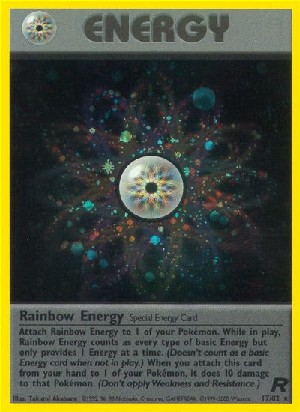Attach Rainbow Energy to 1 of your Pokemon. While in play, Rainbow Energy counts as every type of basic Energy but only provide 12 Energy at a time. (Doesn't count as a basic Energy card when not in play.) When your attach this card from your hand to 1 of your Pokemon, it does 10 damage to that Pokemon. (Don't apply Weakness and Resistance.)