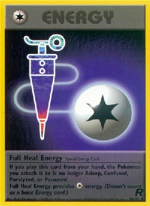 If you play this card from your hand, the Pokemon your attach it to is no longer Asleep, Confused, Paralyzed, or Poisoned. Full Heal Energy provide energy. (Doesn't count as a basic Energy card.)