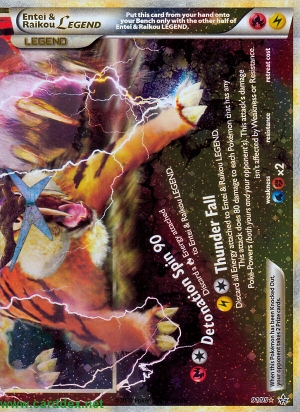 Kosten: Lege alle an Entei & Raikou-LEGENDE angelegte Energien auf deinen Ablagestapel. Dieser Angriff fügt jedem Pokémon (deinen und denen deines Gegners), das NICHT über Poké-Power verfügt, 80 Schadenspunkte zu. Der Schaden dieses Angriffs wird durch Schwäche und Resistenz nicht verändert.   Schaden: