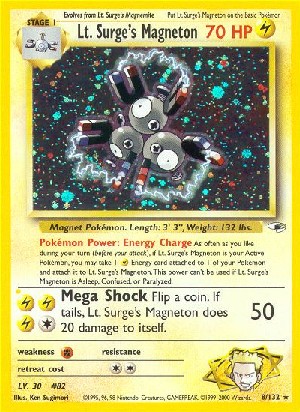 As often you like during your turn (before your attack), if Lt. Surge´s Magneton is your active Pokemon, you may take 1 Energy card attached to one of your Pokemon and attach it to Lt. Surge´s Magneton. This power can´t be used if Lt. Surge´s Magneton is Asleep, Confused or Paralyzed.