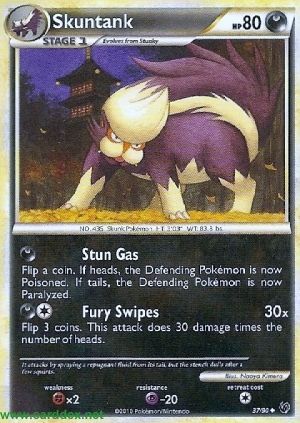 Kosten: Wirf eine Münze. Bei „Kopf“ ist das Verteidigende Pokémon jetzt vergiftet. Bei „Zahl“ ist das Verteidigende Pokémon jetzt gelähmt.   Schaden: