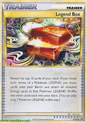 Beschreibung: Decke die obersten 10 Karten deines Decks auf. Falls du beide Hälften einer Pokémon-LEGENDE aufdeckst, lege diese auf deine Bank und lege alle aufgedeckten Energiekarten an die Pokémon-LEGENDE an. Mische die anderen Karten anschließend in dein Deck. (Auf diese Art kannst du nur 1 Pokémon-LEGENDE spielen.)