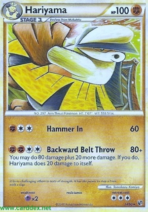 Kosten: Dieser Angriff kann 80 Schadenspunkte plus 20 weitere Schadenspunkte zufügen. In diesem Fall fügt Hariyama sich selbst 20 Schadenspunkte zu.   Schaden: