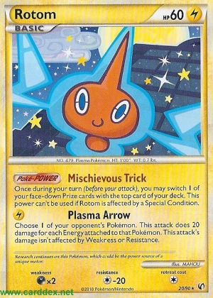 Einmal während deines Zuges (vor deinem Angriff) kannst du 1 deiner mit der Bildseite nach unten liegenden Preiskarten gegen die oberste Karte deines Decks austauschen. Diese Poké-Power kann nicht benutzt werden, falls Rotom von einem Speziellen Zustand betroffen ist.