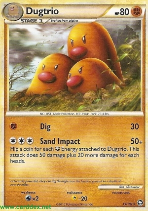 Kosten: Wirf für jede an Digdri angelegte -Energie 1 Münze. Dieser Angriff fügt 50 Schadenspunkte plus 20 weitere Schadenspunkte mal der Anzahl „Kopf“ zu.   Schaden: