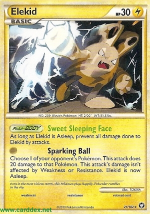 Wähle 1 Pokémon deines Gegners. Dieser Angriff fügt dem gewählten Pokémon 20 Schadenspunkte zu. Der Schaden dieses Angriffs wird durch Schwäche und Resistenz nicht verändert. Elekid schläft jetzt.