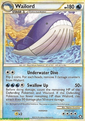 Bevor der Schaden zugefügt wird, vergleiche die verbliebenen KP des Verteidigenden Pokémon und Wailord. Wenn das Verteidigende Pokémon weniger verbliebene KP hat als Wailord, fügt dieser Angriff 50 Schadenspunkte plus 50 weitere Schadenspunkte zu.