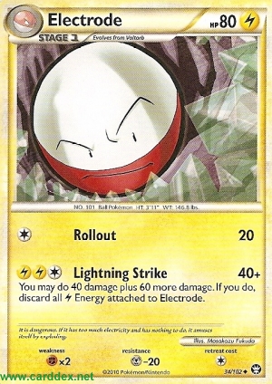 Du kannst mit diesem Angriff kann 40 Schadenspunkte plus 60 weitere Schadenspunkte zufügen. Wenn du das machst, lege alle an Lektrobal angelegten -Energien auf deinen Ablagestapel.