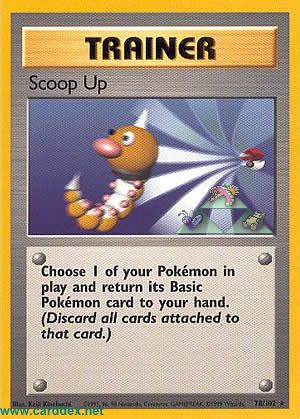 Wähle eines Deiner Pokemon im Spiel und nimm seine Basis-Karte auf Deine Hand zurück (Entferne alle auf dieser Karte abgelegte Karten.)