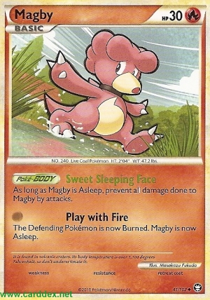 Kosten: Das Verteidigende Pokémon ist jetzt verbrannt. Magby schläft jetzt.   Schaden: