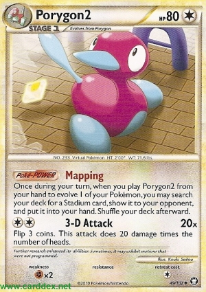 Einmal während deines Zuges kannst du, wenn du Porygon2 von deiner Hand spielst, um 1 deiner Pokémon zu entwickeln, dein Deck nach 1 Stadion-Karte durchsuchen, sie deinem Gegner zeigen und sie auf die Hand nehmen. Mische anschließend dein Deck.