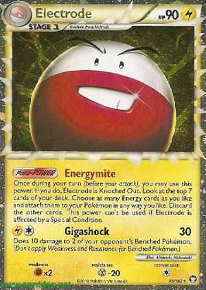| Einmal während deines Zuges (vor deinem Angriff) kannst du diese Poké-Power benutzen. Wenn du das machst, wird Lektrobal kampfunfähig. Schau dir die obersten 7 Karten deines Decks an. Wähle beliebig viele Energiekarten, die du dort gefunden hast, und lege sie in beliebiger Verteilung an deine Pokémon an. Lege die anderen Karten auf deinen Ablagestapel. Diese Poké-Power kann nicht verwendet werden, wenn Lektrobal von einem Speziellen Zustand betroffen ist.
