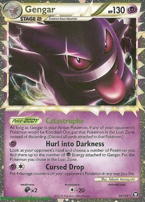 Solange Gengar dein Aktives Pokémon ist, lege alle Pokémon deines Gegners, die kampfunfähig gemacht würden, nicht auf den Ablagestapel, sondern ins Nirgendwo. (Lege alle an dieses Pokémon angelegten Karten auf den jeweiligen Ablagestapel).