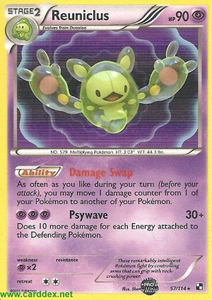 Beliebig oft während deines Zuges (vor deinem Angriff) kannst du 1 Schadensmarke von 1 deiner Pokémon auf ein anderes deiner Pokémon verschieben.