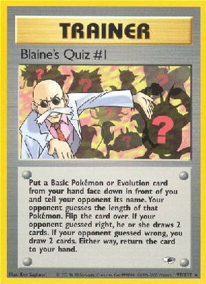 Beschreibung: Put a Basic Pokemon or Evolotion card from your hand face down in front of you and tell your opponent its name. Your opponent guesses the length of that Pokemon. Flip the card over. If your oppponent guesses right, he or she draws 2 cards. If your opponent guesses wrong, you draw 2 cards. Either way, return the crad to your hand.
