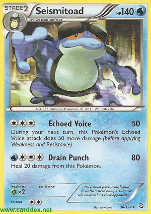 Kosten: Während deines nächsten Zuges fügt die Attacke Widerhall dieses Pokémon 50 weitere Schadenspunkte zu (bevor Schwäche und Resistenz verrechnet werden).   Schaden: