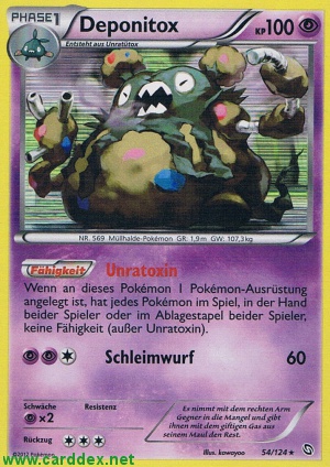 Wenn an dieses Pokémon 1 Pokémon-Ausrüstung angelegt ist, hat jedes Pokémon im Spiel, in der Hand beider Spieler oder im Ablagestapel beider Spieler, keine Fähigkeit (außer Unratoxin).