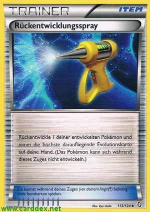 Rückentwickle 1 deiner entwickelten Pokémon und nimm die höchste daraufliegende Evolutionskarte auf deine Hand. (Das Pokémon kann sich während dieses Zuges nicht entwickeln.)