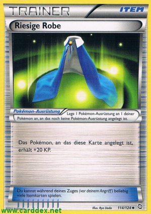 Lege Riesige Robe an 1 deiner Pokémon an, das keine Pokémon-Ausrüstung hat. Wenn dieses Pokémon kampfunfähig wird, lege diese Karte auf deinen Ablagestapel.